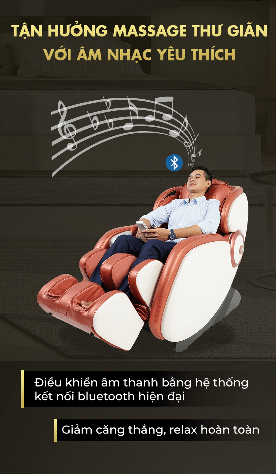 Tích hợp tích năng nghe nhạc Bluetooth cho phép kết nối với điện thoại của bạn chỉ qua một giác cắm. Giờ đây, bạn có thể tận hưởng từng giây phút thoải mái nhất khi nằm lên chiếc ghế massage. Dám chắc rằng những lo toan phiền muộn của bạn sẽ dần tan biến.