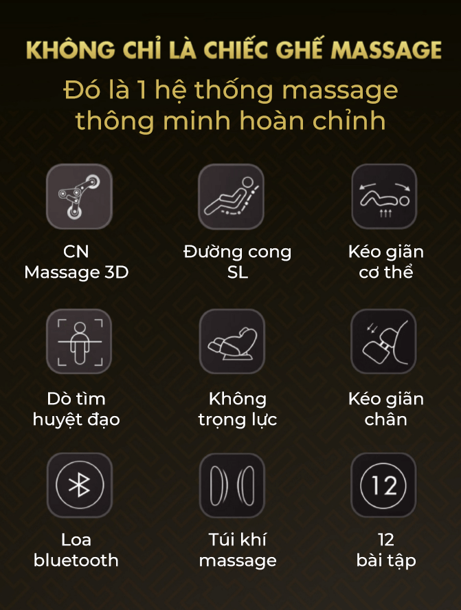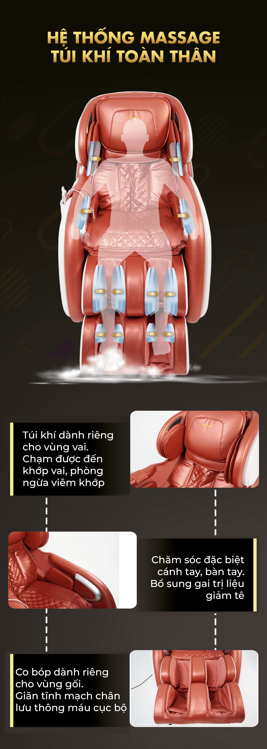Tính năng massage bằng túi khí: Ghế massage thực hiện liệu trình massage cơ thể bằng túi khí từ bàn chân, bắp chân, mông, tay đến tận từng ngón tay
