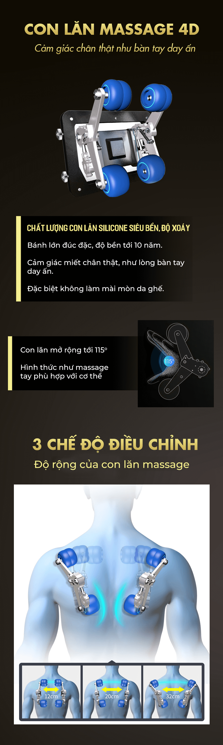 Chế độ con lăn 4D di chuyển linh động chỉ với 1 nút điều khiển duy nhất: Chế độ này cho phép con lăn có thể di chuyển và dừng ở bất kỳ điểm nào mà người dùng mong muốn. Bạn có thể tận hưởng sự thoải mái khi từng vị trí trên cơ thể được massage chuyên sâu.