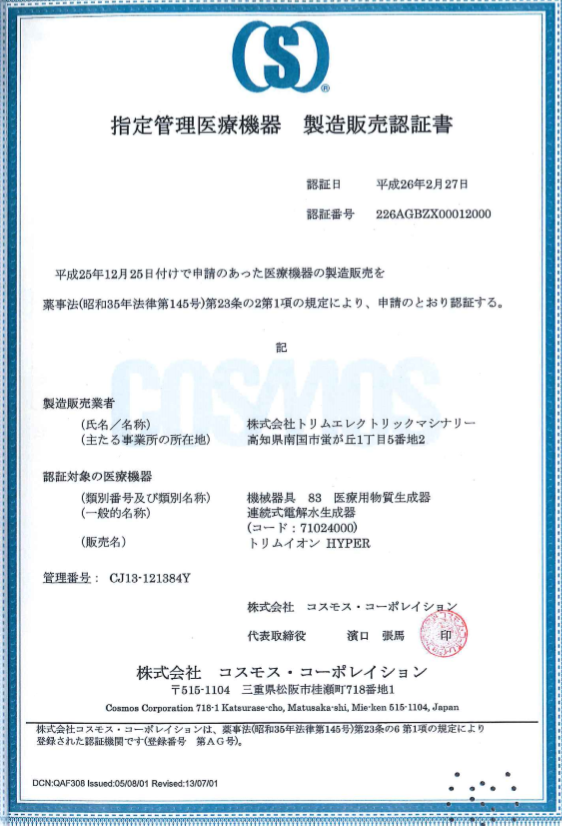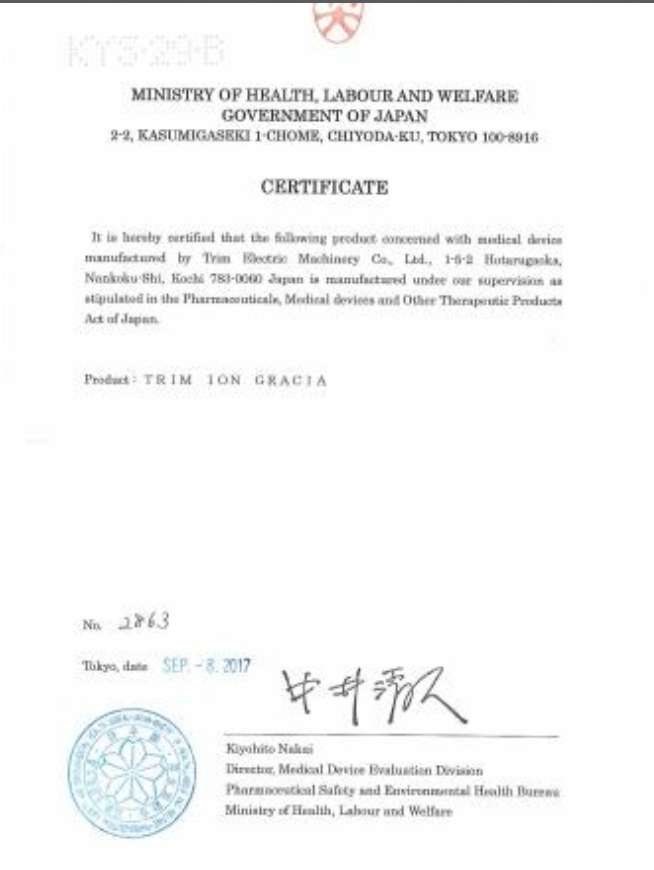 Trim ion được chứng nhận là thiết bị Y tế y tế, mỗi thiết bị có mã quản lý thiết bị y tế do bộ y tế của Nhật Bản cấp.